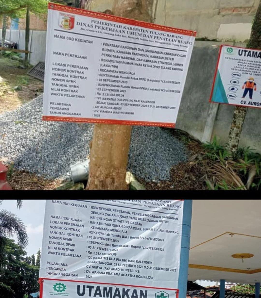 Papan informasi yang terpampang di Kecamatan Menggala, Kabupaten Tulangbawang, memuat dua proyek dengan nilai kontrak fantastis yang dibiayai oleh Anggaran Pendapatan Belanja Daerah (APBD) Tulangbawang. Dengan rinciannya: Rehabilitasi Rumah Dinas Ketua DPRD Tulang Bawang (Lanjutan) Nilai Kontrak: Rp2.121.228.634, Pelaksana: CV Aurora Abadi, Pengawas: CV Vianika Wastu Bhumi, Waktu Pelaksanaan: 120 hari kalender.
